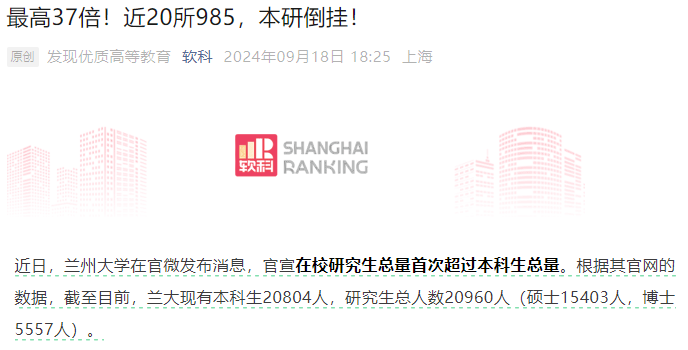 据软科消息,近20所985本研倒挂,也就是研究生数量超过本科生数量,中科院的研究生数量甚至高达本科生的37倍。