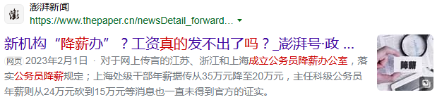 比如,网传江苏、浙江和上海成立公务员降薪办公室,落实公务员降薪规定;上海处级干部年薪据传从35万元降至20万元,主任科级公务员年薪则从24万元砍到15万元;贵州成立“降薪办”等等。