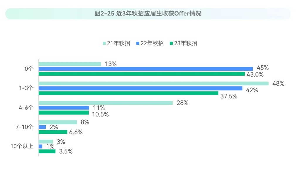 在今年1月发布的《2023秋季校园招聘白皮书》中,64.1%的24届学生在秋招中投递超30家企业,同比增长33.1%。然而,逐渐变多的投递公司数量,也没能为毕业生们带来一个合适的工作岗位。有43%的毕业生收到offer数量为0,而2021年秋招该比例仅为13%。